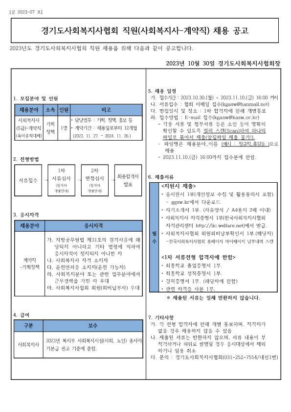 [채용] 공2023-7호 경기도사회복지사협회 직원(사회복지사-계약직) 채용 공고