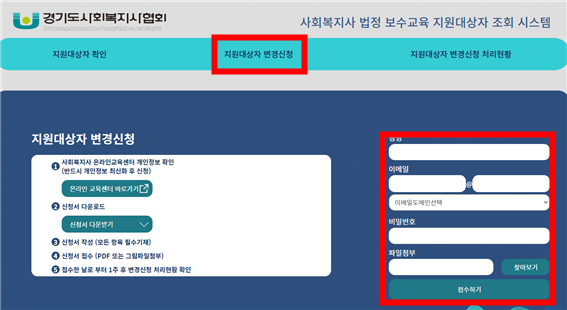 : 사회복지사 법정 보수교육 지원대상자 조회 시스템(ggedu.kr)접속→지원대상자 변경신청 클릭→신청서 다운받아 작성→성명, 이메일, 비밀번호 입력 후