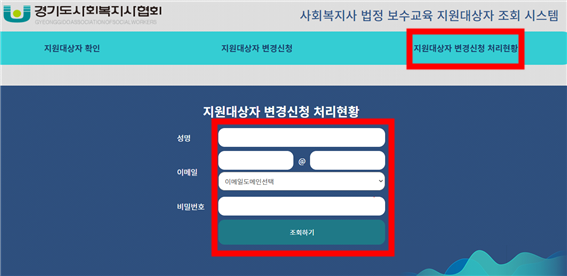 : 사회복지사 법정 보수교육 지원대상자 조회 시스템(ggedu.kr)접속→지원대상자 변경신청 처리현황 클릭→변경 신청 시 작성한 성명, 이메일, 비밀번호 입력 후 [조회하기] 클릭하여 조회