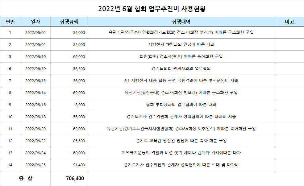 2022년 6월 업무추진비 사용내역을 아래와 같이 공개합니다.
