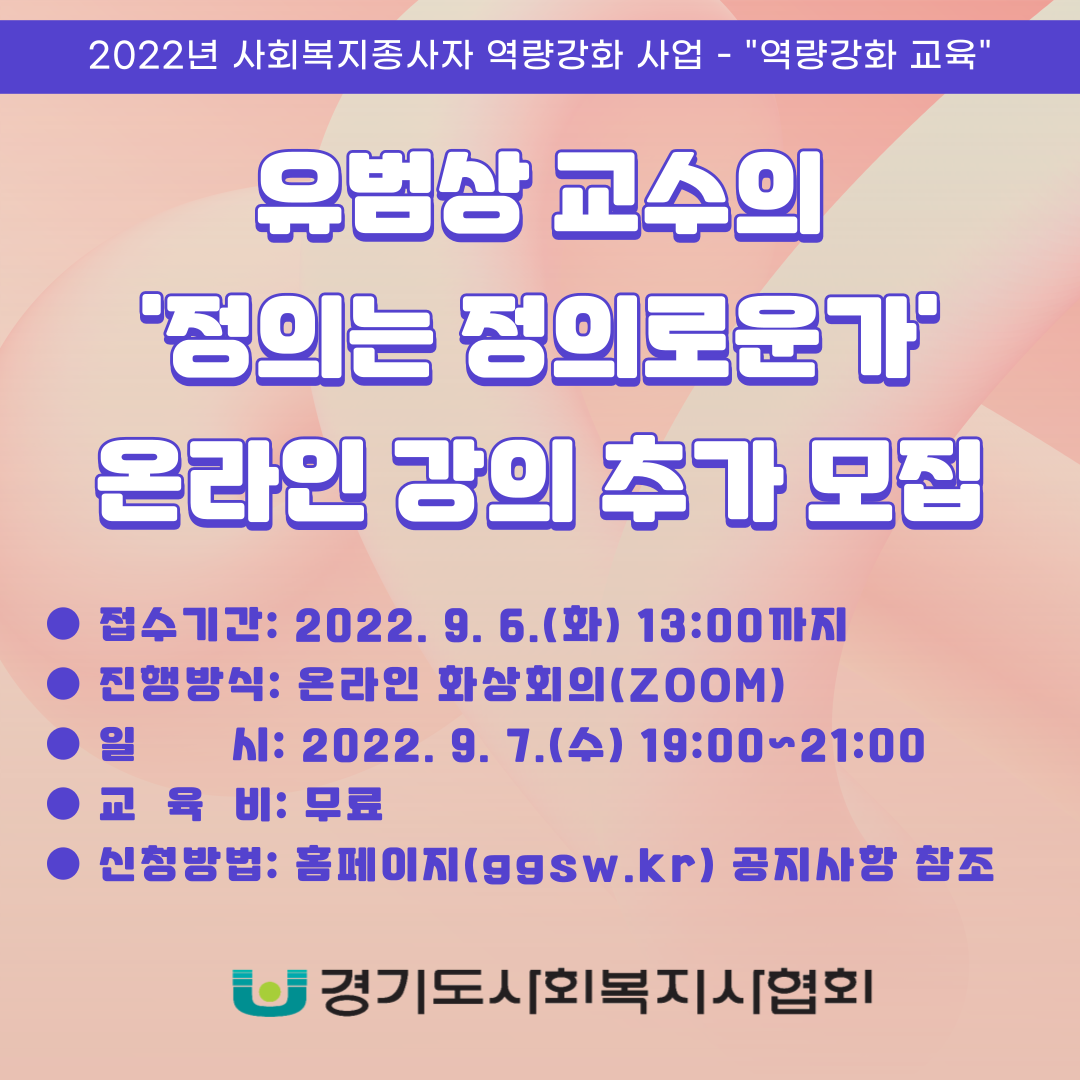 관련하여 경기도사회복지사협회는 \'정의는 정의로운가(사회복지정의론)\' 강의의 참여자를 추가 모집하오니