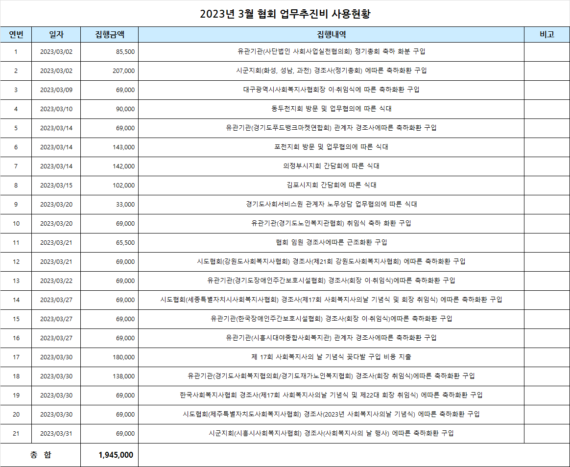 2023년 3월 업무추진비 사용내역을 아래와 같이 공개합니다.