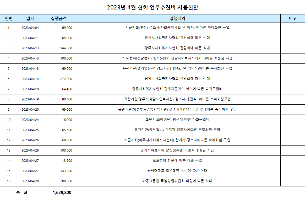 2023년 4월 업무추진비 사용내역을 아래와 같이 공개합니다.