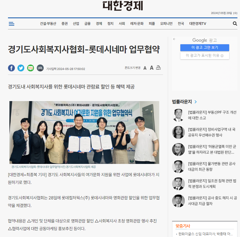 [2024. 5. 28. 대한경제] 경기도사회복지사협회-롯데시네마 업무협약