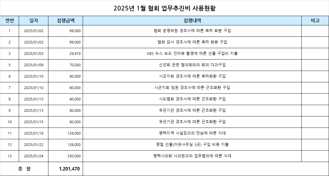 2025년 1월 업무추진비 사용내역을 아래와 같이 공개합니다.