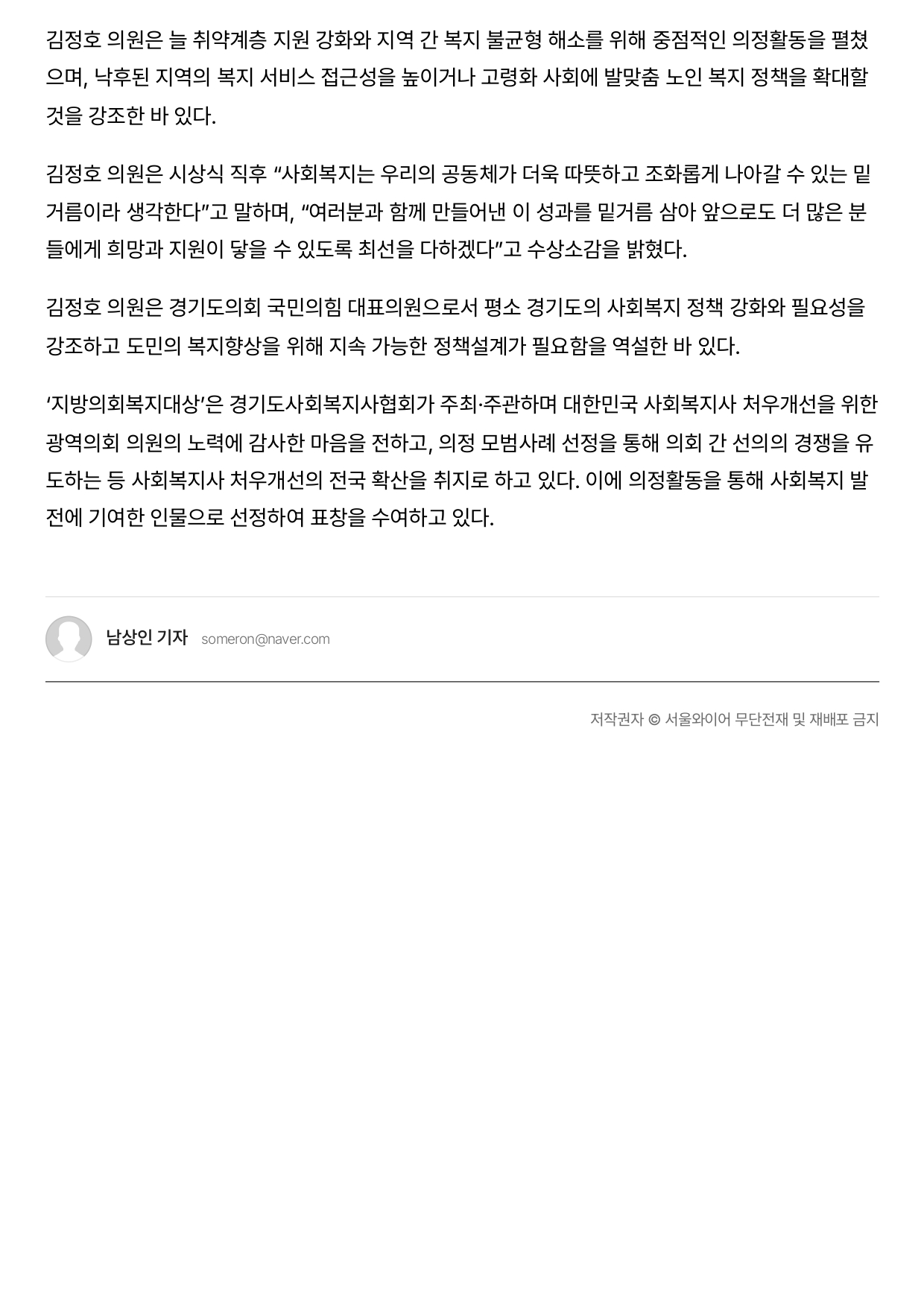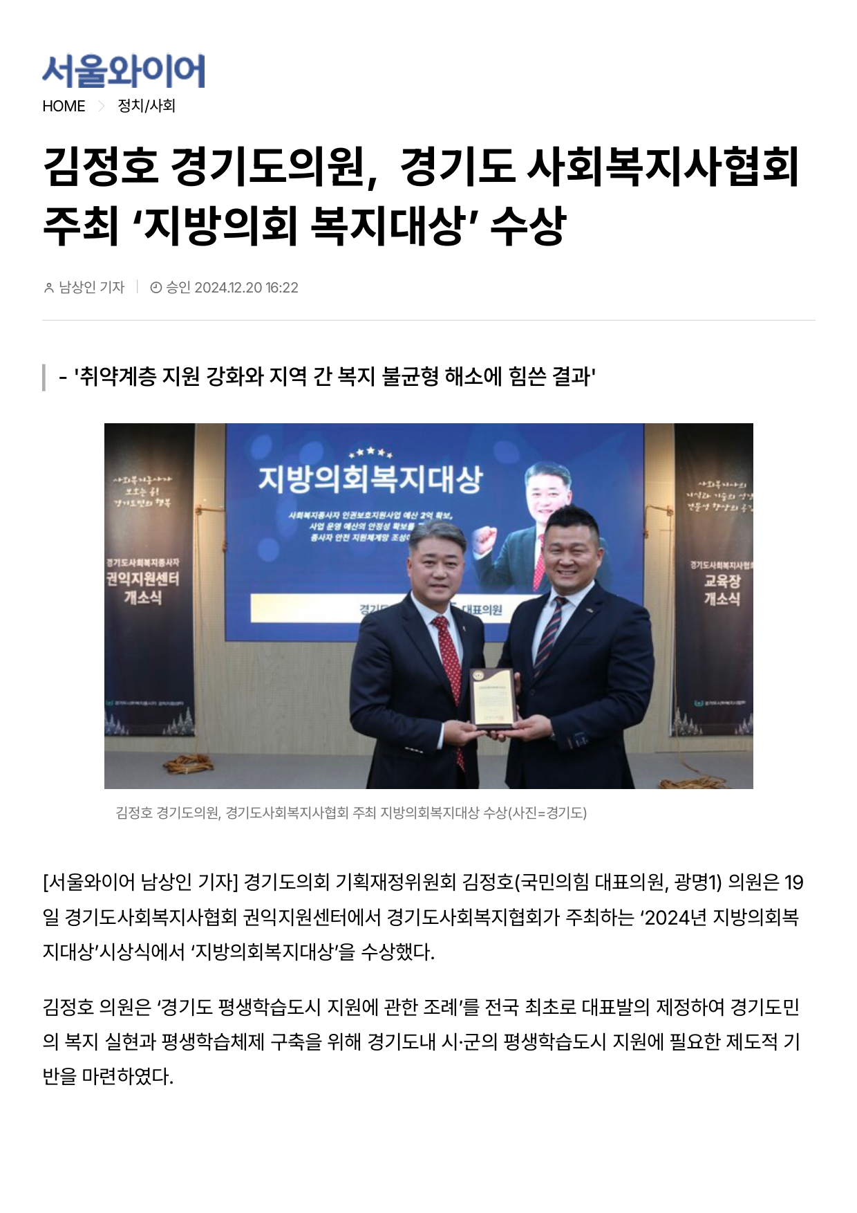 [2024.12.20. 서울와이어] 김정호 경기도의원, 경기도 사회복지사협회 주최 ‘지방의회 복지대상’ 수상
