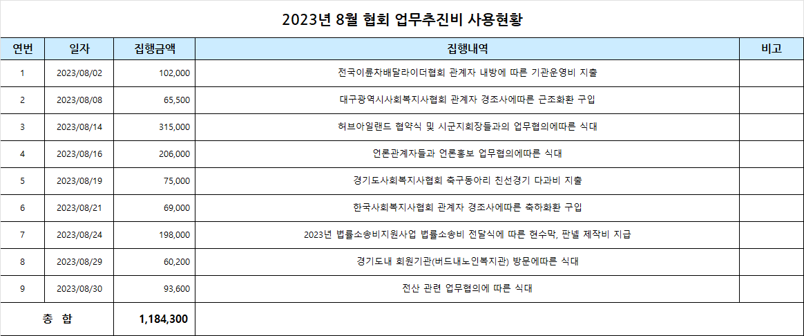 경기도사회복지사협회 사무처에서는 2023년 8월 업무추진비 사용내역을 아래와 같이 공개합니다.앞으로도 보다 투명하고 합리적인 예산집행이 될 수 있도록 더욱 노력하겠습니다.-담당자 : 최보람 대리(T.252-7554)