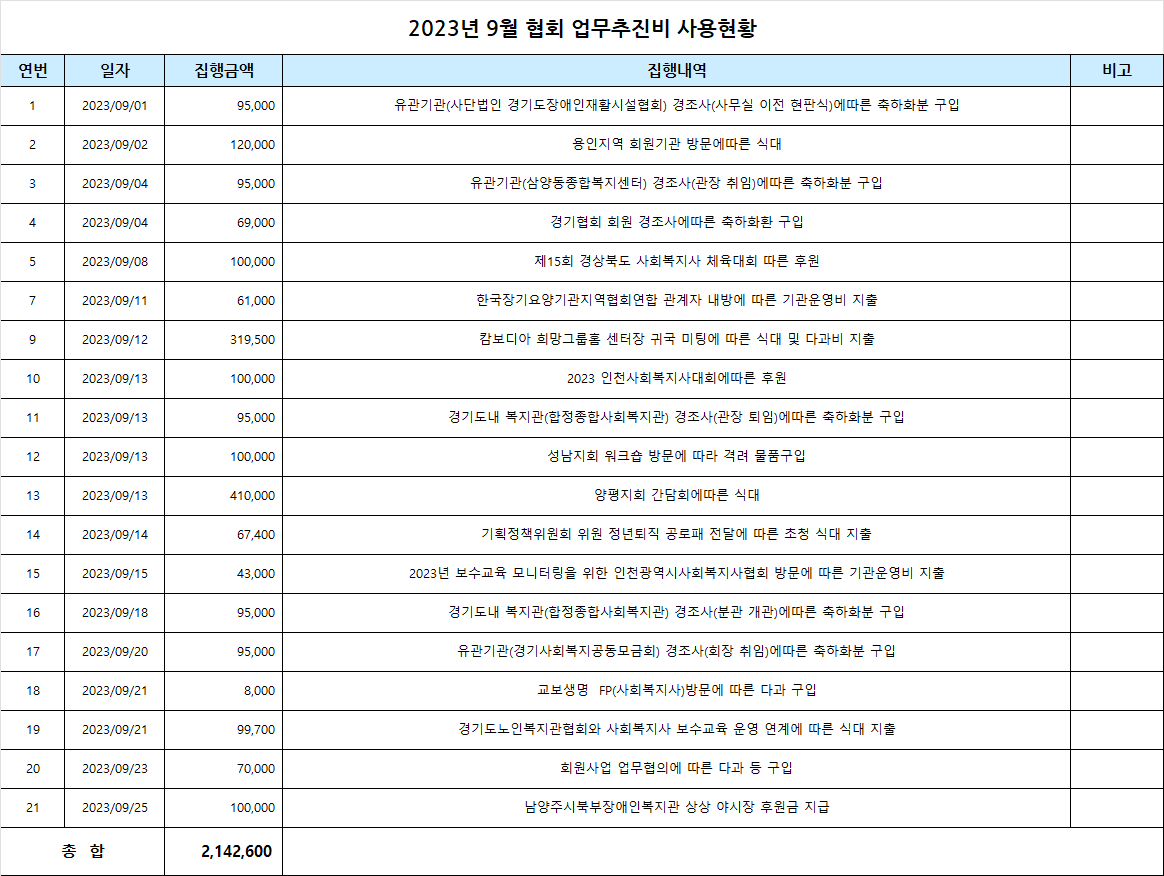 경기도사회복지사협회 사무처에서는 2023년 9월 업무추진비 사용내역을 아래와 같이 공개합니다.앞으로도 보다 투명하고 합리적인 예산집행이 될 수 있도록 더욱 노력하겠습니다.-담당자 : 최보람 대리(T.252-7554)