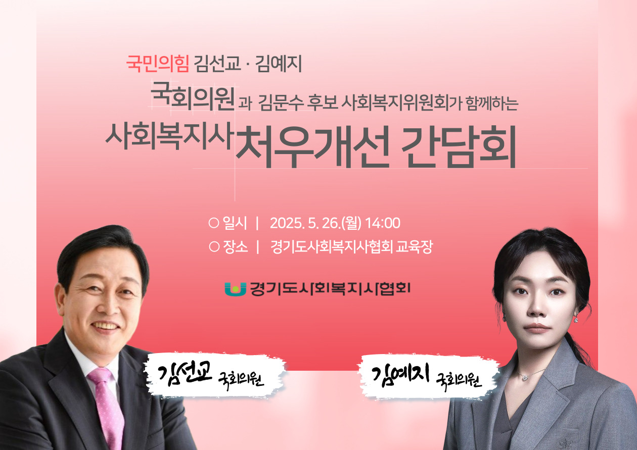 경기도사회복지사협회는 5월 26일(월), 협회 교육장에서 김선교·김예지 국회의원경기도의회 의원, 김문수 후보 사회복지위원회가 함께 하는 사회복지사 처우개선 간담회를 개최했습니다.이번 간담회는 사회복지사 처우개선이 지역 차원 대응과 더불어 국가적 차원에서도 대응해야하는 문제이며현장의 생생한 목소리를 중앙정부에 직접 전달하기 위해서는국회의원과 함께 논의가 필요하다고 판단되어 실시하게 되었습니다.간담회에는 김선교(여주, 양평), 김예지(비례) 국회의원김정호(광명), 김재훈(안양), 이혜원(양평), 정경자(비례) 경기도의회 의원장순욱 국민의힘 사회복지위원회 위원장, 박찬수 경기도사회복지사협회장을 포함하여60여명의 현장 종사자가 참석해주셨습니다. 이 자리에서 협회는 △ 100% 경력인정, △ 인건비 가이드라인 100% 준수△ 종사자 정년연장, △ 경력관리시스템 도입△ 경기도 처우개선비 인상 및 지급대상자 확대 등의 주요 정책과제를 제시하였습니다.김선교(여주, 양평) 의원은 “종사자들의 열악한 근무환경을 다시 한번 체감했다.”며“오늘과 같은 간담회를 정례화하여 의견을 듣고 정책과 제도 개선으로 이어지도록 최선을 다하겠다.”고 말했으며김예지(비례) 의원은 “사회복지사 등의 처우 및 지위 향상을 위한 법률 일부개정법률안이 통과될 수 있도록힘을 다할 것”, “앞으로 국민의힘이 사회복지사의 힘이 되어드릴 수 있도록 거듭나겠다.”며사회복지사에 대한 지속적인 관심과 지지를 약속했습니다.김정호(광명) 국민의힘 대표의원은 "박찬수 경기도사회복지사협회장과 지속 논의하며해당 과제들을 속히 해결해나갈 수 있도록 노력하겠다"고 의지를 전했습니다.박찬수 협회장은 사회복지사는 모든 국민의 생존권을 보장하기 위해국민 삶의 최일선에서 복지서비스를 제공하는 공공인력으로, 적정한 인력수급과 최적의 근무환경 조성은국민의 행복 추구로 이어지는 중요한 사항임을 강조하였습니다.
