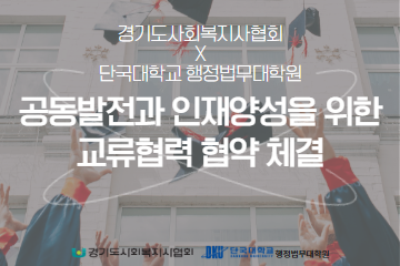 [경기도사회복지사협회 X 단국대학교 행정법무대학원 업무협약 체결] 26년 전기 입학생부터 경기도사회복지사협회 추천을 받아 단국대학교 행정법무대학원에 입학하는 협회 회원에게 매 학기 40% 학비감면 혜택을 제공합니다!미래 사회복지 전문가로서 한 단계 더 도약하고 싶으신 회원님들의 열정적인 도전을 기다립니다.