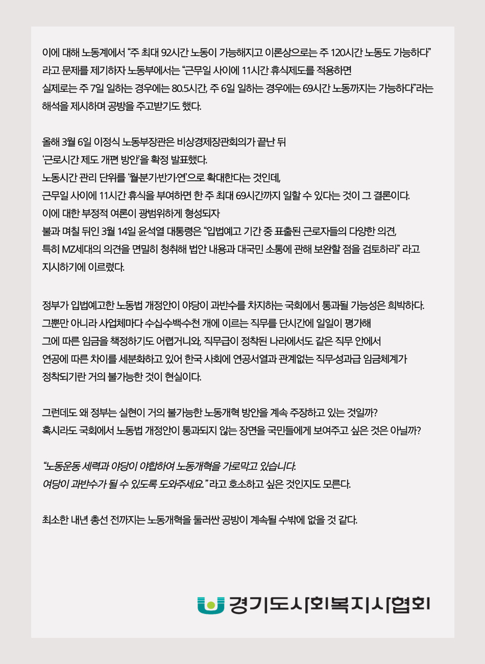 올해 3. 6. 이정식 노동부장관은 비상경제장관회의가 끝난 뒤 ‘근로시간 제도 개편 방안’을 확정 발표했다. 노동시간 관리 단위를 ‘월·분기·반기·연’으로 확대한다는 것인데, 근무일 사이에 11시간 휴식을 부여하면 한 주 최대 69시간까지 일할 수 있다는 것이 그 결론이다. 이에 대한 부정적 여론이 광범위하게 형성되자 불과 며칠 뒤인 14일 윤석열 대통령은 “입법예고 기간 중 표출된 근로자들의 다양한 의견, 특히 MZ세대의 의견을 면밀히 청취해 법안 내용과 대국민 소통에 관해 보완할 점을 검토하라”라고 지시하기에 이르렀다.