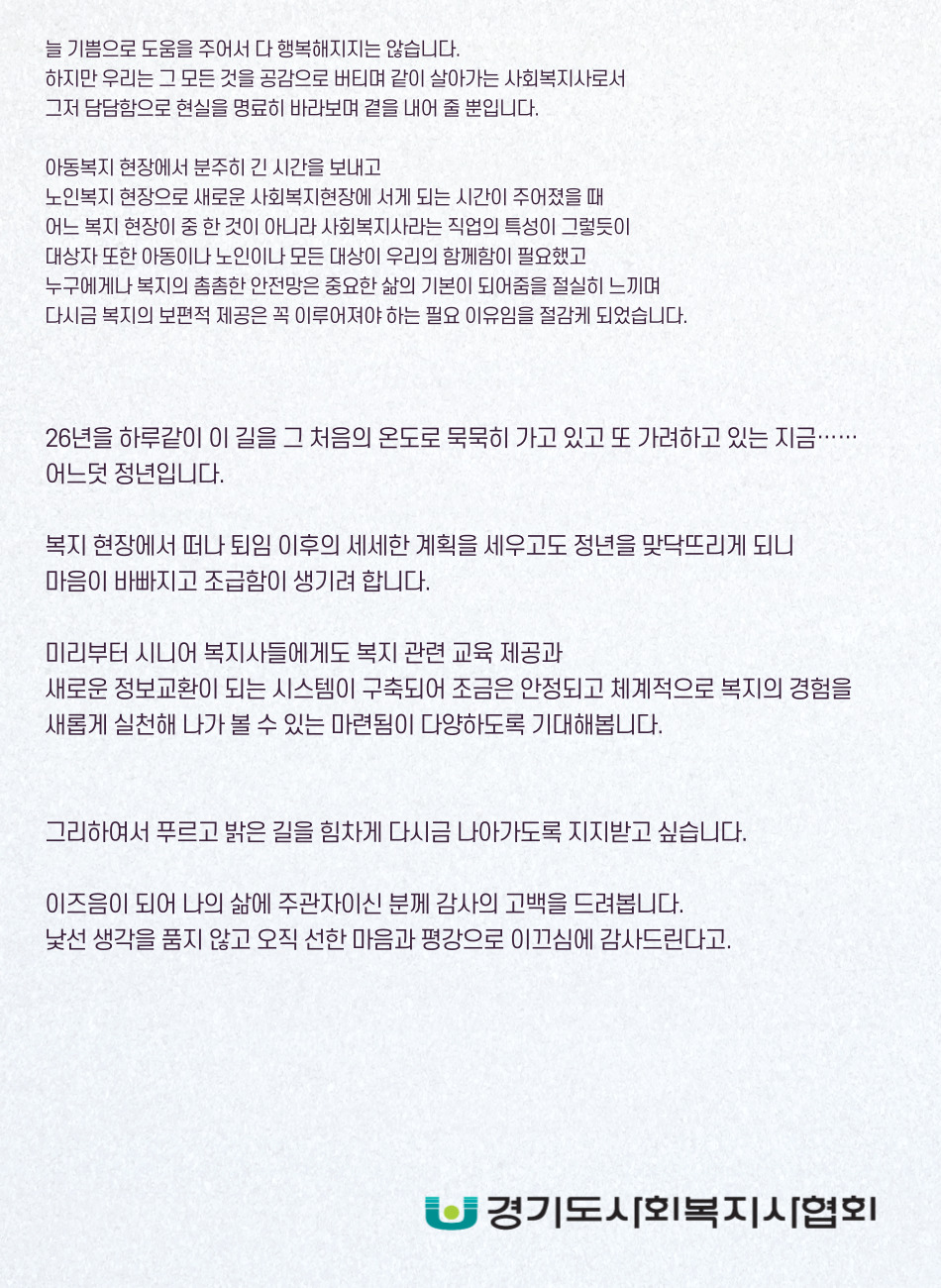 아동복지 현장에서 분주히 긴 시간을 보내고 노인복지 현장으로 새로운 사회복지현장에 서게 되는 시간이 주어졌을 때 어느 복지 현장이 중 한 것이 아니라 사회복지사라는 직업의 특성이 그렇듯이 대상자 또한 아동이나 노인이나 모든 대상이 우리의 함께함이 필요했고 누구에게나 복지의 촘촘한 안전망은 중요한 삶의 기본이 되어줌을 절실히 느끼며 다시금 복지의 보편적 제공은 꼭 이루어져야 하는 필요이유임을 절감케 되었습니다.
