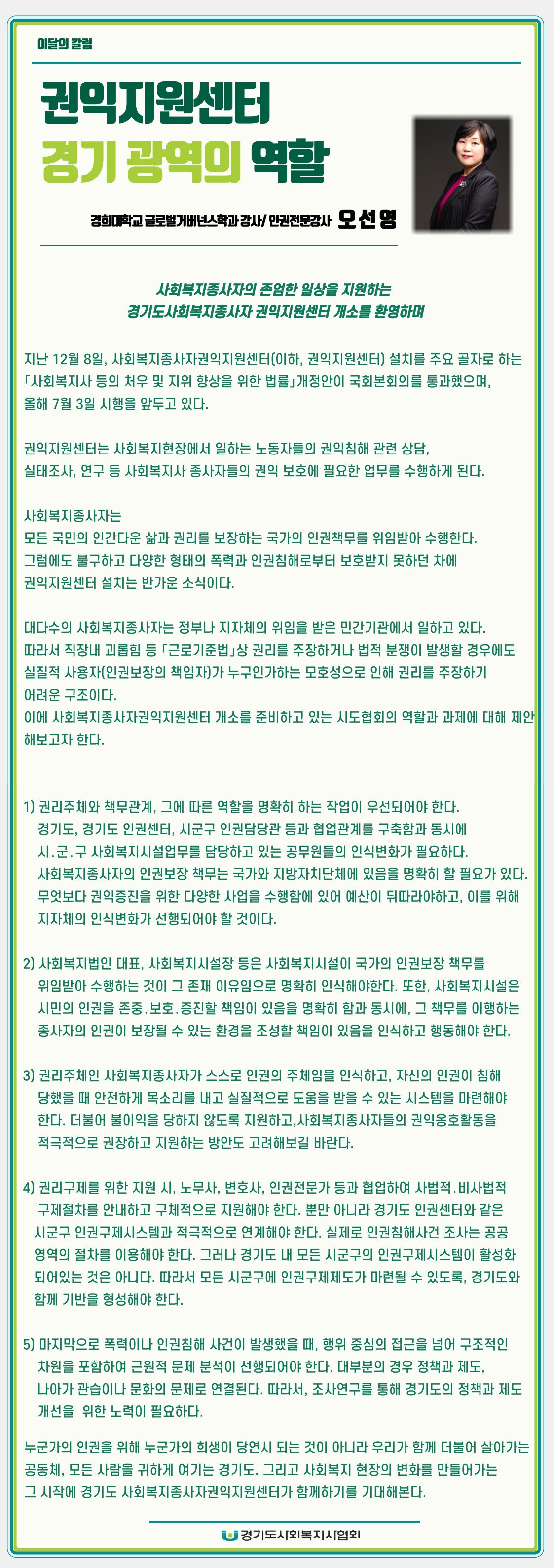 권익지원센터 경기 광역의 역할 경희대학교 글로벌거버넌스학과 강사 오선영 사회복지종사자의 존엄한 일상을 지원하는 경기도사회복지종사자 권익지원센터 개소를 환영하며 지난 12월 8일, 사회복지종사자권익지원센터(이하, 권익지원센터) 설치를 주요 골자로 하는 「사회복지사 등의 처우 및 지위 향상을 위한 법률」개정안이 국회본회의를 통과했으며, 올해 7월 3일 시행을 앞두고 있다. 권익지원센터는 사회복지현장에서 일하는 노동자들의 권익침해 관련 상담, 실태조사, 연구 등 사회복지사 종사자들의 권익 보호에 필요한 업무를 수행하게 된다. 사회복지종사자는 모든 국민의 인간다운 삶과 권리를 보장하는 국가의 인권책무를 위임받아 수행한다. 그럼에도 불구하고 다양한 형태의 폭력과 인권침해로부터 보호받지 못하던 차에 권익지원센터 설치는 반가운 소식이다. 대다수의 사회복지종사자는 정부나 지자체의 위임을 받은 민간기관에서 일하고 있다. 따라서 직장내 괴롭힘 등 「근로기준법」상 권리를 주장하거나 법적 분쟁이 발생할 경우에도 실질적 사용자(인권보장의 책임자)가 누구인가하는 모호성으로 인해 권리를 주장하기 어려운 구조이다.