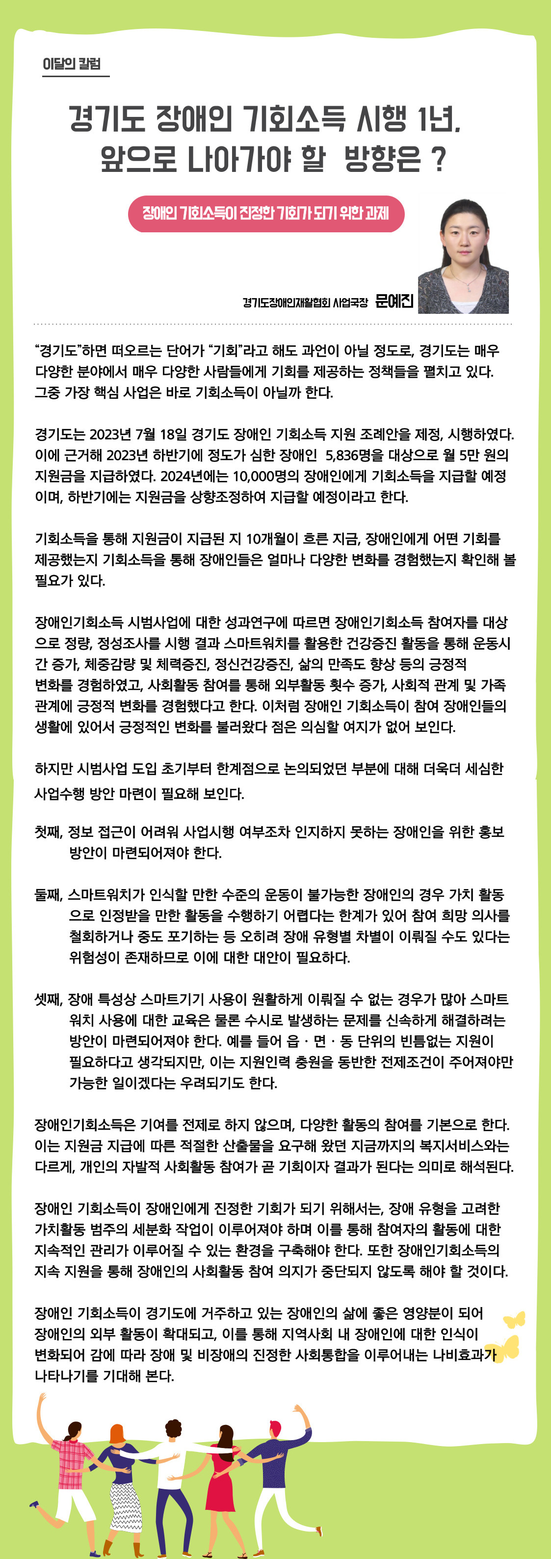 [제23호] 경기도 장애인 기회소득 시행 1년, 앞으로 나아가야 할 방향은? (경기도장애인재활협회 문예진 사업국장)