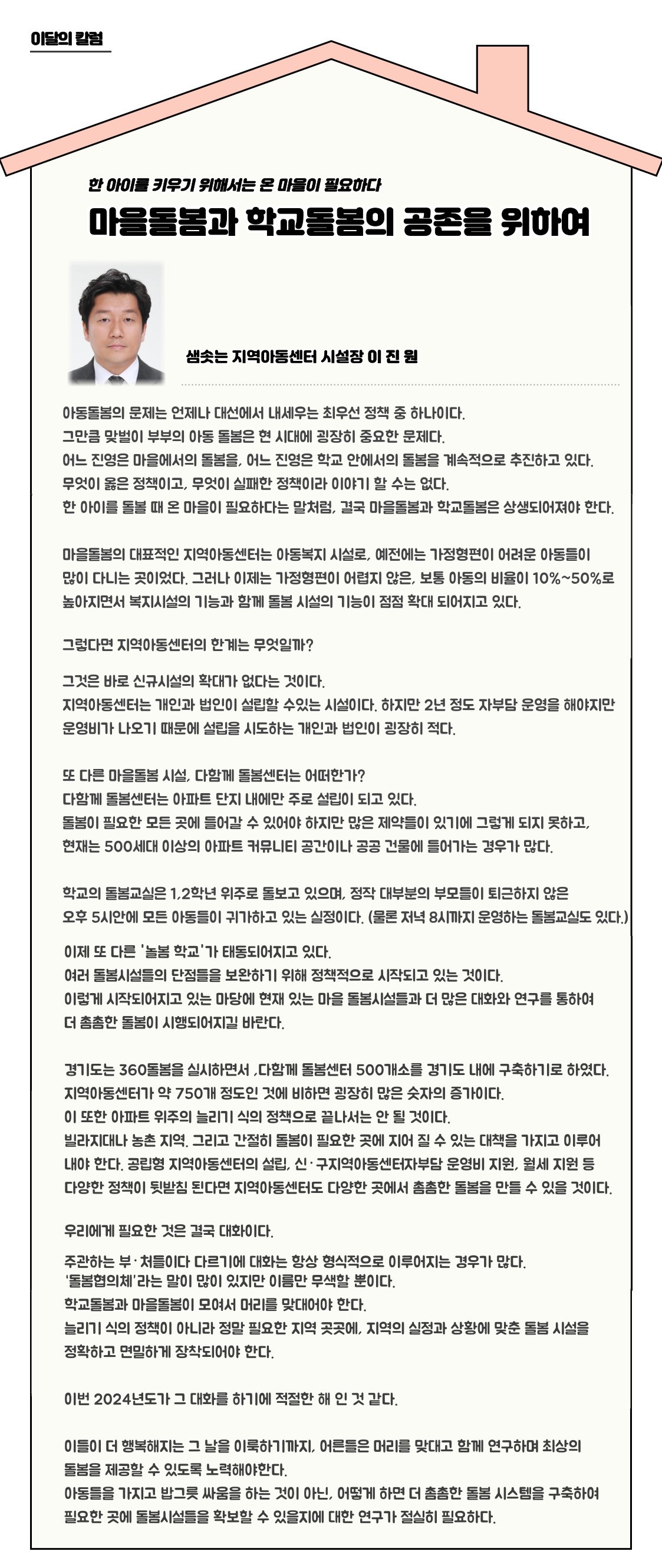 [제24호] 마을돌봄과 학교돌봄의 공존을 위하여 (샘솟는지역아동센터 이진원 시설장)