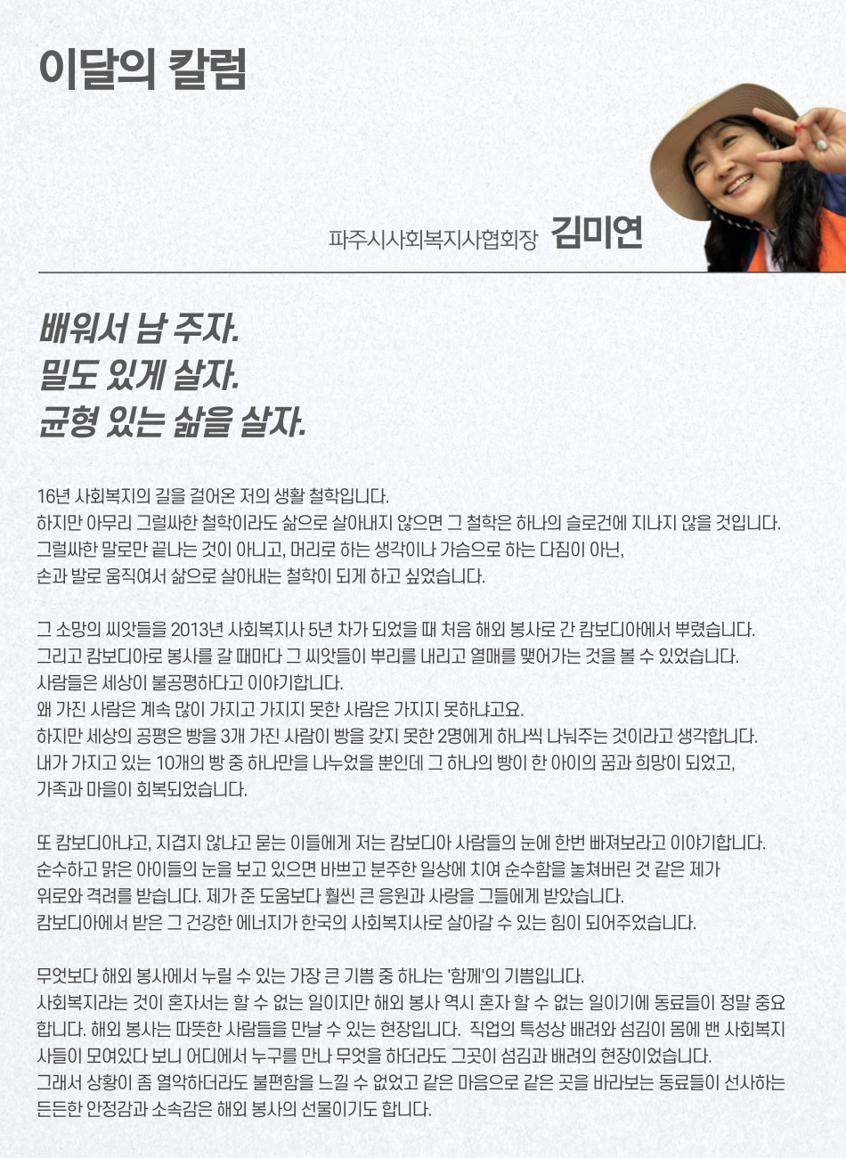 배워서 남 주자. 밀도 있게 살자. 균형 있는 삶을 살자. 파주시사회복지사협회장 김미연 16년 사회복지의 길을 걸어온 저의 생활 철학입니다. 하지만 아무리 그럴싸한 철학이라도 삶으로 살아내지 않으면 그 철학은 하나의 슬로건에 지나지 않을 것입니다. 그럴싸한 말로만 끝나는 것이 아니고, 머리로 하는 생각이나 가슴으로 하는 다짐이 아닌, 손과 발로 움직여서 삶으로 살아내는 철학이 되게 하고 싶었습니다. 그 소망의 씨앗들을 2013년 사회복지사 5년 차가 되었을 때 처음으로 해외 봉사로 간 캄보디아에서 뿌렸습니다. 그리고 캄보디아로 봉사를 갈 때마다 그 씨앗들이 뿌리를 내리고 열매를 맺어가는 것을 볼 수 있었습니다. 사람들은 세상이 불공평하다고 이야기합니다. 왜 가진 사람은 계속 많이 가지고 가지지 못한 사람은 가지지 못하냐고요. 하지만 세상의 공평은 빵을 3개 가진 사람이 빵을 갖지 못한 2명에게 하나씩 나눠주는 것이라고 생각합니다. 내가 가지고 있는 10개의 빵 중 하나만을 나누었을 뿐인데 그 하나의 빵이 한 아이의 꿈과 희망이 되었고, 가족과 마을이 회복되었습니다.