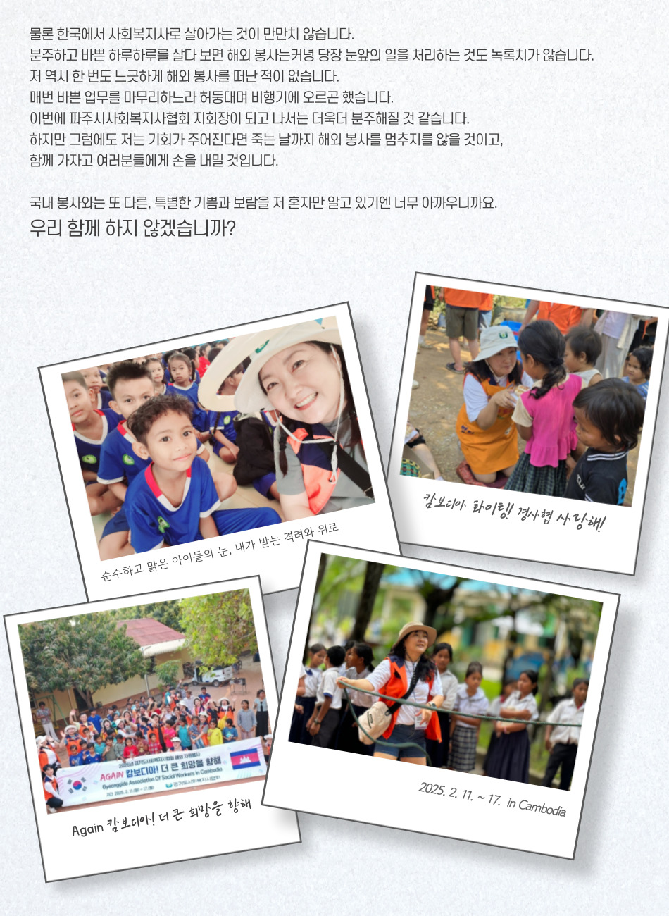 또 캄보디아냐고, 지겹지 않냐고 묻는 이들에게 저는 캄보디아 사람들의 눈에 한번 빠져보라고 이야기합니다. 순수하고 맑은 아이들의 눈을 보고 있으면 바쁘고 분주한 일상에 치여 순수함을 놓쳐버린 것 같은 제가 위로와 격려를 받습니다. 제가 준 도움보다 훨씬 큰 응원과 사랑을 그들에게 받았습니다. 캄보디아에서 받은 그 건강한 에너지가 한국의 사회복지사로 살아갈 수 있는 힘이 되어주었습니다.
