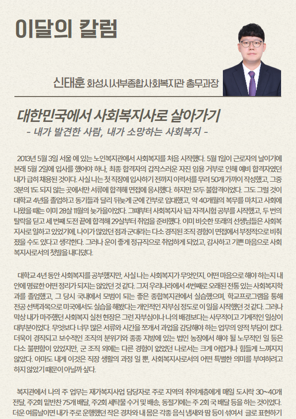 [제36호] 대한민국에서 사회복지사로 살아가기 (화성시서부종합사회복지관 총무과장 신태훈)