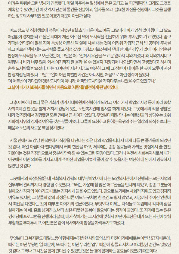 - 내가 발견한 사람, 내가 소망하는 사회복지 - 화성시서부종합사회복지관 총무과장 신태훈 2013년 5월 3일 서울에 있는 노인복지관에서 사회복지를 처음 시작했다. 5월 1일이 근로자의 날이기에 본래 5월 2일에 입사를 했어야 하나, 최종 합격자의 갑작스러운 자진 임용 거부로 인해 예비 합격자였던 내가 급히 채용된 것이다. 사실 나는 첫 직장에 입사하기 전까지 이력서를 무려 50개 가까이 작성했고, 그중 3분의 1도 되지 않는 곳에서만 서류에 합격해 면접에 응시했다. 하지만 모두 불합격이었다. 그도 그럴 것이 대학교 4년을 졸업하고 동기들과 달리 뒤늦게 군에 간부로 입대했고, 약 40개월의 복무를 마치고 사회에 나왔을 때는 이미 28살 11월의 늦가을이었다. 그때부터 사회복지사 1급 자격시험 공부를 시작했고, 두 번의 탈락을 딛고 세 번째 도전 끝에 합격해 29살부터 취업을 준비했다. 이미 비슷한 또래의 선생님들은 사회복지사로 일하고 있었기에, 나이가 많았던 점과 군대라는 다소 경직된 조직 경험이 면접에서 부정적으로 비춰졌을 수도 있다고 생각한다. 그러나 운이 좋게 정규직으로 취업하게 되었고, 감사하고 기쁜 마음으로 사회복지사로서의 첫발을 내디뎠다. 대학교 4년 동안 사회복지를 공부했지만, 사실 나는 사회복지가 무엇인지, 어떤 마음으로 해야 하는지 내 안에 명료한 어떤 정리가 되지는 않았던 것 같다. 그저 우리나라에서 4번째로 오래된 전통 있는 사회복지학과를 졸업했고, 그 당시 국내에서 모범이 되는 좋은 종합복지관에서 실습했으며, 학교프로그램을 통해 전공 선택과목으로 미국에서도 실습을 해봤다는 개인적인 자부심 정도로 이 일을 시작했던 것 같다. 그러나 막상 내가 마주했던 사회복지 실천 현장은 그런 자부심이나 나의 배경보다는 사무적이고 기계적인 일상이 대부분이었다. 무엇보다 너무 많은 서류와 시간을 쪼개서 과업을 감당해야 하는 업무의 양적 부담이 컸다. 더욱이 경직되고 보수적인 조직의 분위기와 종종 지방에 있는 법인 농장에서 해야 될 노무적인 일 등은 다소 불편함이 있었지만, 군 조직 외에는 다른 경험이 없었던 나로서는 크게 어렵거나 힘들게 느껴지지 않았다. 아마도 내게 이것은 직장 생활의 과정 일 뿐, 사회복지사로서의 어떤 특별한 의미를 부여하려고 하지 않았기 때문이 아닐까 싶다. 복지관에서 나의 주 업무는 재가복지사업 담당자로 주로 지역의 취약계층에게 매일 도시락 30~40개 전달, 주2회 밑반찬 75개 배달, 주2회 세탁물 수거 및 배송, 동절기에는 주 2회 국 배달 등을 하는 것이었다. 더운 여름날이면 내가 주로 운행했던 작은 경차와 내 몸은 각종 음식 냄새와 땀 등이 섞여서 글로 표현하기 어려운 퀴퀴한 그런 냄새가 진동했다. 매일 마주하는 일상에서 몸은 고되고 늘 피곤했지만, 그래도 그것을 계속할 수 있었던 건 이것 역시 단순히 물건을 전달하고, 일지를 쓰고, 필요한 예산을 신청해서 그것을 집행하는 정도의 사무적인 일로 여겼기 때문이 아닐까 싶다. 어느 정도 첫 직장생활에 적응이 되었던 8월 초 무더운 어느 여름, 그날따라 비가 엄청 많이 왔다. 그 날도 어김없이 경차를 타고 높은 지대에 계신 어르신 댁에 도시락을 전달하기 위해 부지런히 가고 있었다. 좁고 가파른 언덕길이 많은 지역 특성상 어르신 댁 앞에 차를 대는 것이 어려워 가급적 근처 빈 공터에 주차를 하고 어르신 댁까지는 도시락을 들고 직접 갔었다. 평소 어르신께서 댁에 안 계신 경우가 많아, 미리 약속된 찬장에 도시락을 두고 오곤 했는데, 그날은 어르신께서 우산을 쓰고 문 앞까지 나와 계셨다. 왜 나와 계시냐고 여쭤보니 비가 너무 많이 와서 여기까지 잘 올라 올 수 있을지 걱정되어 나오셨다면서 고생했다고 하시며 손수 도시락을 받으셨다. 나는 10여년이 지난 지금도 여전히 그 때 그 장면이 내 마음 한 곳에 오롯이 사진 한 장처럼 남아 있다. 그날 그 일이 어떤 특별한 사건은 아니지만, 처음으로 이런 생각이 들었다. ‘아 어르신이 기다렸던 것은 도시락이 아니라, 어쩌면 도시락을 가져다주는 나였을 수도 있겠구나.’ 그 날이 내가 사회복지를 하면서 처음으로 ‘사람’을 발견하게 된 날이었다. 그 후 어찌하다 보니 좋은 기회가 생겨서 대학원에 진학하게 되었고, 여러 가지 학업의 사정 등에 따라 종합사회복지관 한곳을 짧게 거쳐서 강남에 있는 노인복지관에 입사를 하게 되었다. 그곳에서의 직장 생활은 내가 첫 직장에서 경험했던 모든 면에서 큰 차이가 있었다. 무엇보다 매일 만나는 어르신들의 상당수는 소위 사회적 지위와 경제적 여유를 갖춘 분들이었다. 그들이 요청하고 원하는 욕구의 주는 일상의 의식주 보다는 배움과 노년의 새로운 역할 찾기였다. 서울 안에서도 강남 한복판에서 직장을 다닌다는 것은 나의 직업을 떠나서 내게 나름 큰 즐거움이 되었던 것 같다. 매일 아침마다 별다방에서 커피 한잔을 하고, 저녁에는 종종 동료들과 가까운 맛집에서 술 한잔 기울이는 것은 직장인으로서 충분히 만족 할 수 있는 그런 환경이었다. 그러나 여전히 사회복지사로서 내가 이곳에서 어떤 의미를 가지고 내게 주어진 과업을 어떻게 풀