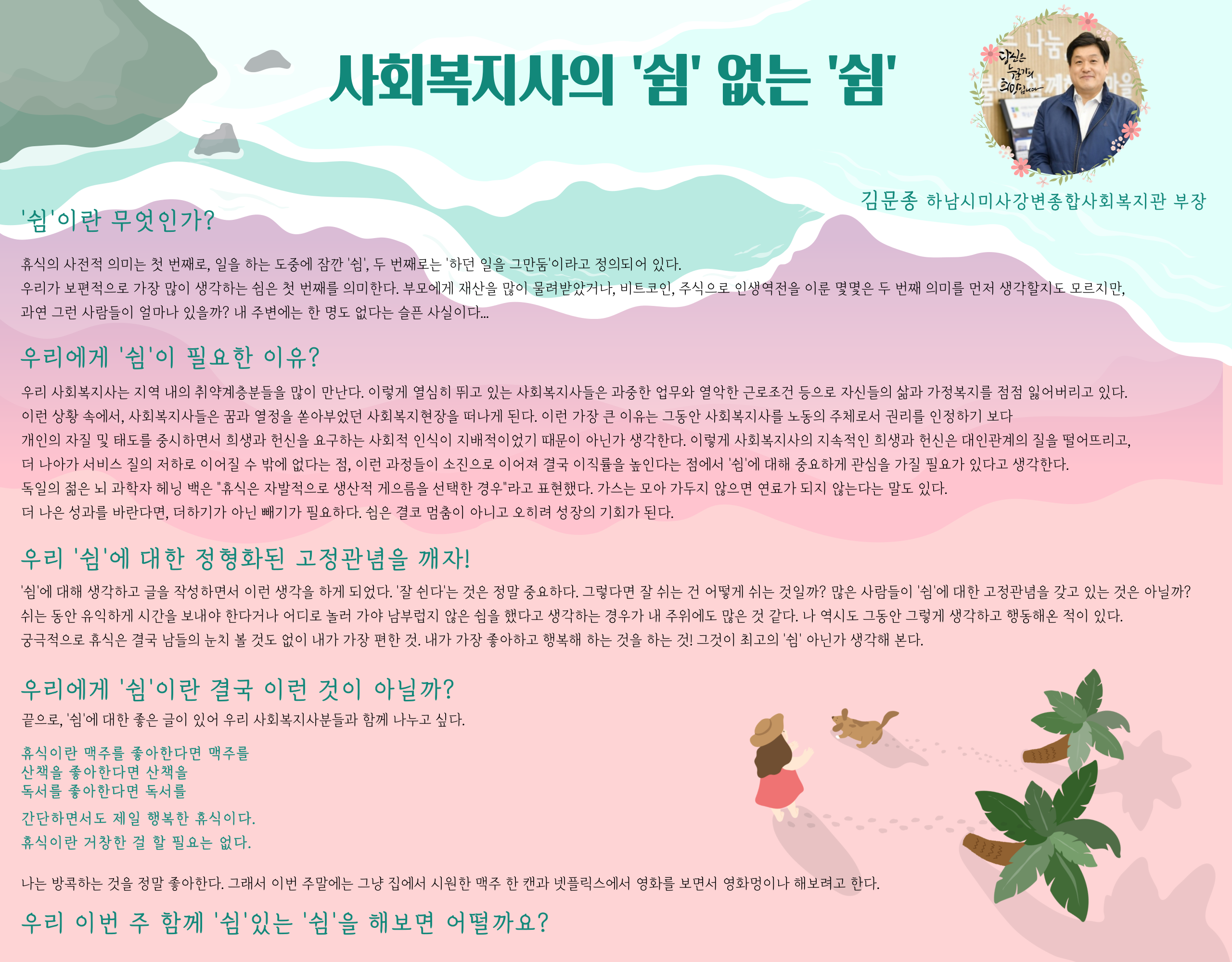 사회복지사의 \'쉼\'없는 \'쉼\' 김문종 하남시미사강변종합사회복지관 부장 쉼(rest)이란 무엇인가?