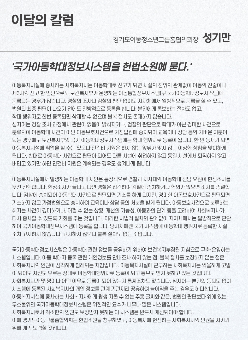 [제17호] 국가아동학대정보시스템을 헌법소원에 묻다(성기만 경기도아동청소년그룹홈협의회장)