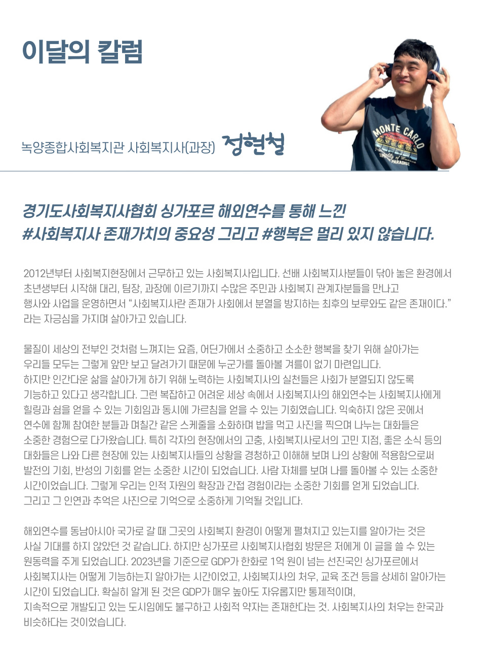 [제18호] 경사협 싱가포르 해외연수를 통해 느낀 사회복지사 존재가치의 중요성, 행복은 멀리 있지 않습니다(정현철 녹양종합사회복지관 과장)