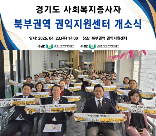 [4/23 북부권역 권익지원센터 개소식 현장 공유드립니다] 오늘 남양주시에서 북부권역 권익지원센터 개소식이 진행되었습니다. 지난 3월 부천에 위치한 서부권역 권익지원센터 개소에 이어, 경기도는 전국 최초로 권역형 권익지원 체계를 구축하고 있습니다. 박찬수 회장은 “권역으로 확대된 권익지원센터가 앞으로 31개 시군 전체에 설치되어 사회복지사들이 보다 안전한 근무환경 속에서 힘이 나는 환경을 만들기 위해 노력하겠다”고 전했으며, 지민규 남양주 지회장은 “개소하기까지 함께 힘써주신 분들께 감사의 인사를 전하며, 사회복지사들의 권익을 지키는 든든한 버팀목이 되길 바란다”고 전했습니다. 또한 이 자리가 있기까지 사회복지 현장과의 지속적인 소통과 처우개선을 위해 힘써온 공로를 기리기 위해 경기도의회 보건복지위원회 정경자 의원에게 '지방의회 복지대상'을 전달했으며, 앞으로도 지금처럼 사회복지 현장을 돌아보는 의정활동이 이어지기를 기대합니다. 개소식을 축하하기 위해 자리를 빛내주신 남양주시 김상수 부시장, 남양주시의회 이경숙 복지환경위원장, 전혜연 운영위원회 부위원장, 중앙 권익지원센터 이재홍 센터장, 경기도인권센터 김형욱 센터장 등을 비롯한 60여명의 참석자분들께 다시 한번 감사드리며, 앞으로 권역형 권익지원센터를 통해 더 밀접하게 권익을 지키고 보다 안전한 근무환경이 이어질 수 있도록 힘쓰겠습니다.